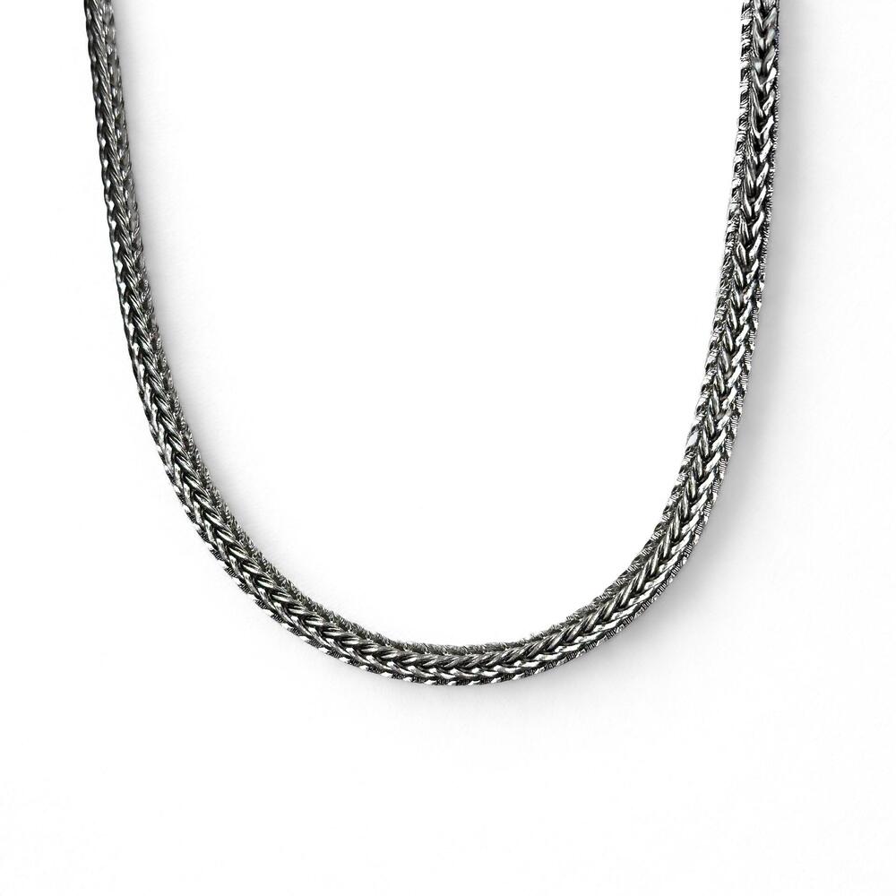 Η “Armor Chain” επαναπροσδιορίζει την κλασική αλυσίδα μέσα από μια πυκνή, γεωμετρική πλέξη που αγκαλιάζει το λαιμό σαν μεταλλικό ύφασμα.